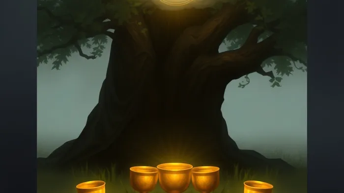Обратите внимание на фон. Дерево символизирует рост, который сейчас замер. Река — поток чувств, который течет мимо. Горы на заднем плане — это далекие, может быть, забытые цели или вызовы. Вся сцена пропитана статикой. Это не активное страдание, а пассивное пребывание в эмоциональном ступоре. И я всегда думаю, что самая сложная работа начинается именно здесь, в этой кажущейся лени. Потому что заставить себя «просто взять» этот кубок нельзя — это будет насилием над собой. Нужно сначала понять, почему рука не поднимается.