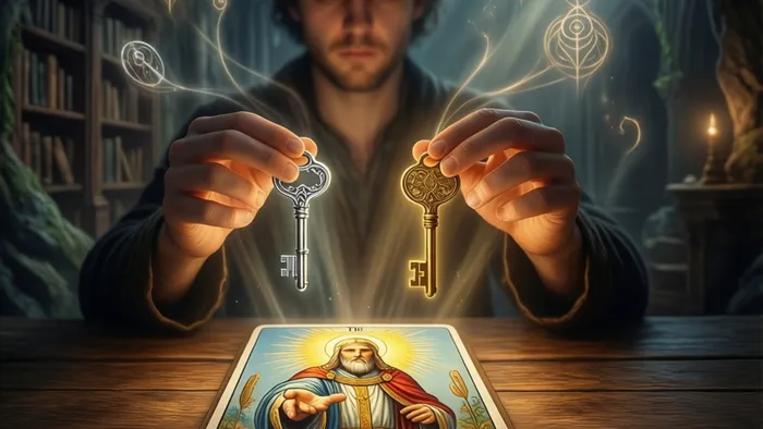 - Скрещенные ключи у ног: Самый важный символ. Ключи от Царствия Небесного? Возможно. Но для нас — это ключи от нашего внутреннего царства. Один ключ — серебряный (сознание, логика), другой — золотой (подсознание, интуиция). Иерофант чувства владеет обоими и учит нас отпирать двери, которые мы сами же и закрыли.