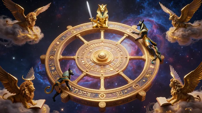 Мы привыкли думать, что управляем своей жизнью. Но это иллюзия, красивая сказка, которую мы рассказываем себе перед сном. Колесо напоминает нам: есть силы, которые намного больше нашего крошечного «Я». Взгляни на карту. В центре — ось, вокруг — символы, животные, буквы. Это не просто картинка, это чертеж твоего существования. Сфинкс сидит наверху, сохраняя ледяное спокойствие. Он — это равновесие. Тифон падает вниз, Анубис поднимается вверх. Это ты. Это я. Это каждый из нас в разные моменты времени.