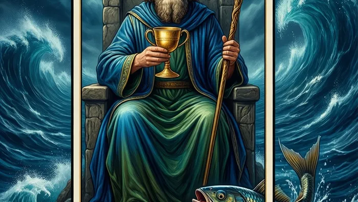Давайте разберем детали. Его трон — каменный, символ устойчивости и воли. Но он стоит в море — царстве эмоций, подсознания, Кубков. Он не боится глубины, он в ней — как дома. Рыба, выпрыгивающая у его ног — это всплывающие интуитивные озарения, которые он умеет ловить. Корона и скипетр — знаки власти, но власти не силовой, а основанной на понимании и сочувствии.