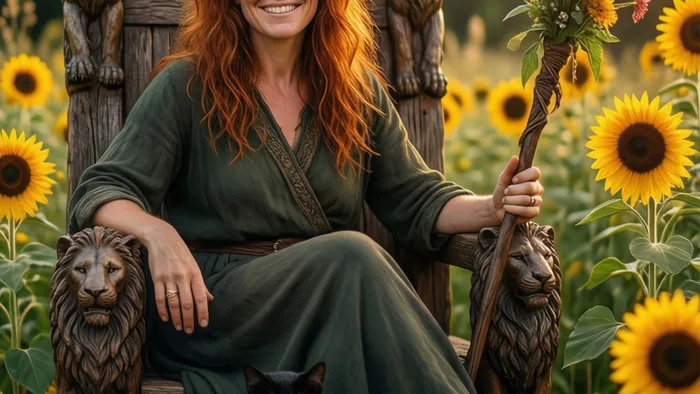 Подсолнухи — второй важнейший символ. Они всегда повернуты к солнцу. Это метафора жизненной силы, оптимизма, веры в лучшее и способности находить свет даже в сложных обстоятельствах. Королева Жезлов сама является таким «солнцем» для своего окружения.
