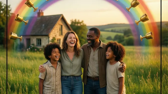 На классическом изображении Уэйта мы видим счастливую семью: родители, дети, танцующие под радугой, на которой и расположены десять кубков. Это не случайная идиллия. Радуга — древний символ союза неба и земли, божественного благословения и человеческих усилий. Она возникает после бури, напоминая, что это счастье — результат пройденных испытаний, кризисов и слез, о которых рассказывают предыдущие карты масти. Дом вдалеке, река, текущая плавно, — все говорит об укорененности, стабильности и непрерывном потоке жизни.