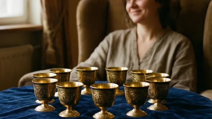 Девять кубков, аккуратно расставленных на синей скатерти, — это не случайная коллекция. Они представляют собой полный спектр эмоционального опыта, который был прожит, осмыслен и теперь мирно пребывает в гармонии. Отсутствие десятого кубка (который символизировал бы переход к следующему, уже пентаклевому уровню материализации) подчёркивает: здесь и сейчас — точка абсолютной эмоциональной завершённости.
