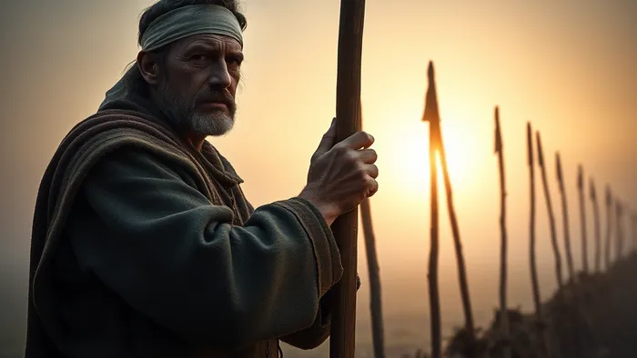 Он стоит, а не сидит. Это готовность в любой момент вернуться к активным действиям. Его поза говорит об усталости («присел отдохнуть» было бы совсем другой картой), но не о сломленности. Перевязь на голове — не просто рана, это маркер опыта, урок, который теперь защищает бдительностью. Он не прячет свою уязвимость, он интегрировал её в свою силу.