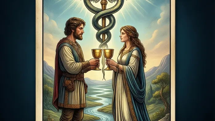Классическое изображение, например, в колоде Райдера-Уэйта, довольно однозначно. Двое людей, мужчина и женщина, обмениваются чашами (кубками) под крылатым посохом Кадуцея. Давайте разберем этот образ по деталям.