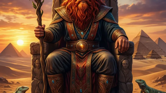 Если попытаться описать его в двух словах, получится «природный лидер». Но это слишком просто. Он не назначенный менеджер, а тот, за кем идут потому, что от него буквально исходит энергия и уверенность. Он сидит на своём троне, держа в руке цветущий жезл — символ созидательной, плодотворной силы. За его спиной — пустыня и пирамиды, знак его амбиций и масштабных, долгосрочных проектов. Ящерицы у его ног — это быстрота мысли, интуитивные озарения, которые он ловит на лету. Его взгляд направлен в сторону от трона. Он не созерцатель. Он деятель, уже задумавший следующий шаг.