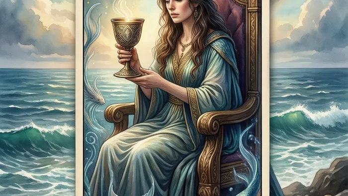 Взгляните на классическое изображение, например, в колоде Уэйта. Вода — её стихия, но трон стоит на суше: это баланс между погружением в чувства и необходимостью оставаться в реальности. Кубок в её руках закрыт крышкой — символ того, что самые сокровенные переживания хранятся внутри, не для всеобщего обозрения. Русалки и волны на троне говорят о связи с подсознанием, с тем, что скрыто под поверхностью. Её взгляд направлен на кубок, а не на зрителя — она прислушивается к внутреннему голосу, а не к внешним советам.