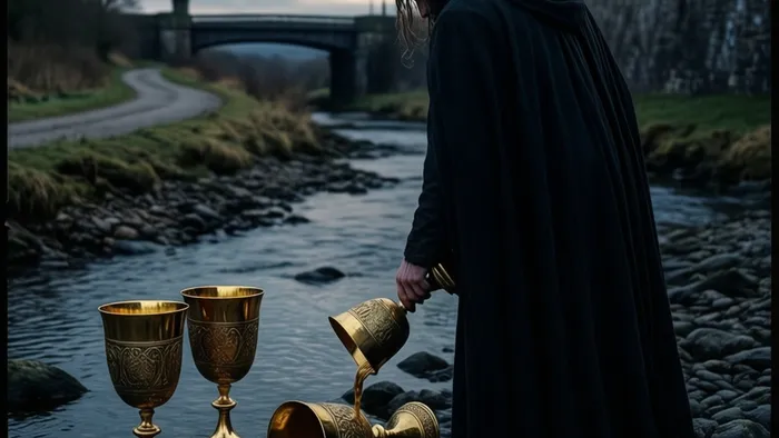 Она отделяет фигуру от двух полных кубков. Это может символизировать поток времени, эмоциональную преграду, чувство отчуждения или просто необходимую дистанцию, которую нужно преодолеть. Река не глубокая и не бурная — её можно перейти.