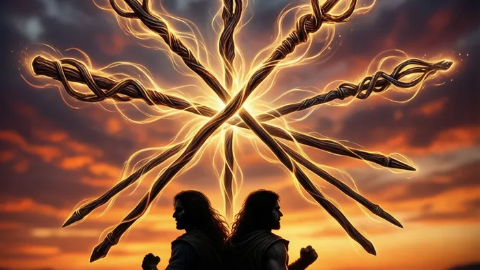 Взгляните на карту в колоде Райдера-Уэйта. Пять юношей с посохами (жезлами) сражаются друг с другом. Но обратите внимание — их жезлы не направлены на тела противников, они скрещены в воздухе. Это не драка на уничтожение, а скорее тренировочный бой, состязание. Они все одеты в яркие одежды — это публичное действо. Кто-то наблюдает? Возможно. И вот тут ключ для любовного расклада: конфликт часто происходит на виду, требует зрителей или вызван желанием доказать что-то окружающим.