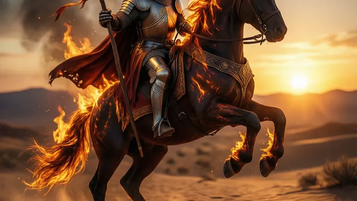 Взгляните на классическое изображение (например, в колоде Уэйта). Всадник в доспехах на вздыбленном коне, в руках — жезл, как факел. Его шлем украшен саламандрой, мифическим существом, живущим в огне. Конь не стоит на месте — он скачет, его грива развевается, создавая ощущение невероятной скорости. Фон часто — пустыня или выжженная земля, что говорит как о жажде достичь цели, так и о потенциальном опустошении после себя. Он не смотрит по сторонам — его взгляд прикован к горизонту, к новой цели. В этом весь ключ: он всегда в движении от чего-то или к чему-то.