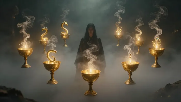 Смотри на эти кубки. В одном — змея, в другом — дракон, в третьем — лавровый венец. В контексте здоровья это означает хаос. Твоё тело сейчас похоже на этот туманный пейзаж. Ты можешь чувствовать тысячу симптомов одновременно, но ни один из них не будет настоящим. Или, что еще опаснее, ты можешь игнорировать реальную бурю, любуясь миражами благополучия. Это карта неясностей. Сложные диагнозы. Врачи разводят руками. Истина ускользает.
