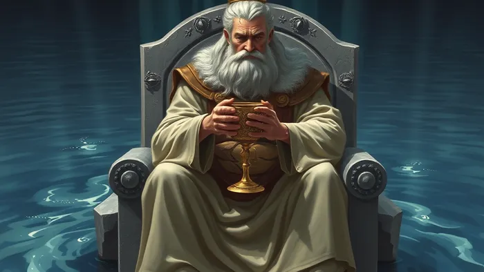 Он сидит на троне посреди моря, но трон его устойчив. Чаша в его руке — не случайный атрибут. Это символ сознательного принятия. Он не пьёт из чаши с жадностью и не отказывается от неё. Он просто держит. В этом весь смысл.