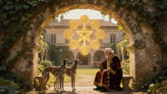 Посмотрите на карту внимательно. Видите старика в богатых одеждах? Он сидит у входа в город, его окружают собаки, а рядом — молодая пара и ребенок. Это три поколения. Это цикл жизни, застывший в золоте. Десять пентаклей здесь расположены в форме каббалистического Древа Жизни. Это не случайность. Это намек на то, что земное благополучие — это отражение божественного порядка.