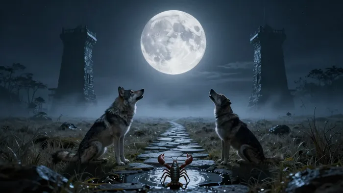 Прежде чем закрыть глаза, внимательно посмотрите на карту. Что вы видите? Две башни на горизонте — это границы между миром рациональным и иррациональным. Собака и волк символизируют нашу прирученную и дикую природу. Они оба воют на луну, потому что чувствуют её власть. Рак, выползающий из воды, — это наши самые древние, архаичные страхи. Те самые, что живут в рептильном мозге. Я как-то раз пробовал представить себя этим раком. Ощущение было, честно говоря, странное — панцирь жмет, а мир кажется огромным и враждебным. Но именно в этом и суть.