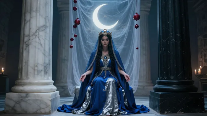 Чтобы медитация прошла успешно, нужно понимать ландшафт, в который вы входите. Жрица сидит между двумя колоннами — Боаз и Яхин. Черная и белая. Тьма и свет. Это не просто декорации. Это указание на то, что истина находится посередине, в точке равновесия. Она держит на коленях свиток Торы, часть которого скрыта складками платья. Это намек: не всё знание доступно сразу. Кое-что откроется только тогда, когда вы будете готовы. Или не откроется вовсе.