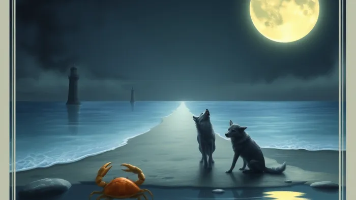 Вода на карте — это классический юнгианский символ коллективного бессознательного, огромного резервуара архетипов, инстинктов и забытых воспоминаний. Берег — наше эго, островок сознательного восприятия. А рак (знак зодиака, управляемый Луной) — это процесс выхода скрытого содержания на поверхность, часто медленный, боковой и пугающий. Он олицетворяет те самые «неудобные» чувства, которые выползают к нам во сне или в моменты кризиса.