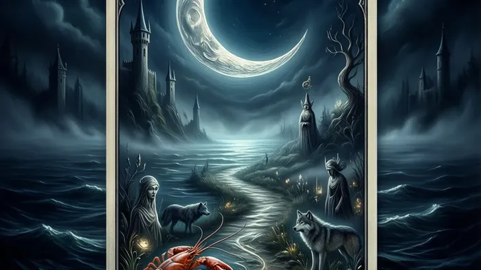 И вот здесь мы подходим к ключевому моменту. Тень, по Юнгу, — это совокупность всех тех качеств, желаний и воспоминаний, которые наше эго считает неприемлемыми и вытесняет в бессознательное. Луна — это тот самый фонарь, который мы направляем в эту тьму. Её свет не рассеивает тени, а, наоборот, делает их более явными, пугающими, искажёнными. Изображение на карте — рак, выползающий из воды, волк и собая на берегу, башня вдалеке — всё это проекции нашего внутреннего содержимого. Волк может быть нашим неконтролируемым гневом, собака — подавленной преданностью, рак — уязвимостью, которую мы прячем под панцирем.