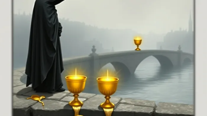 Они находятся на заднем плане, за его спиной, на каменном мосту или устое. Они полны. Это то, что осталось, что сохранилось, ресурсы для поддержки. Друзья, семья, внутренняя сила, новые, ещё не замеченные возможности. Но чтобы их увидеть, нужно отвернуться от разлитых чаш, буквально развернуться. А на это часто не хватает душевных сил.