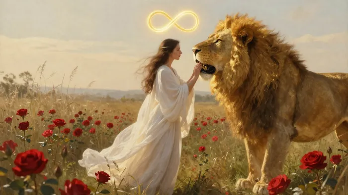 Присмотритесь к деталям. Белое платье женщины символизирует чистоту намерений. Она не преследует корыстных целей, ею движет высший закон. Венок из цветов — это связь с природой. Это не железные цепи рабства, а органическая связь. Сила льва не уничтожается, она трансформируется.