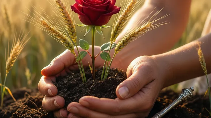 - Река и поле пшеницы: Поток жизни и её плоды. Все находится в движении и приносит урожай.