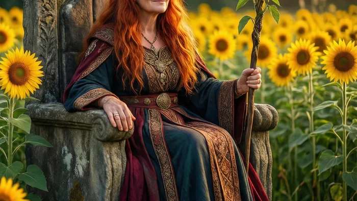 Каждая деталь здесь говорит. Солнечные подсолнухи на троне и платье — символ витальности, ориентации на свет (и на свой внутренний свет). Чёрная кошка у ног — не мистический ужас, а древний символ независимости, интуиции и защиты домашнего очага. Она приручила свои «тёмные», инстинктивные стороны, и теперь они служат ей.