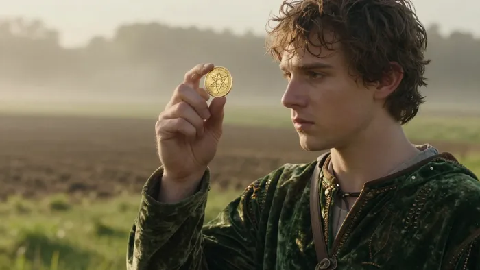 Представьте себе человека, который замер посреди цветущего поля, не замечая ни красоты горизонта, ни тяжести собственных сапог. В его руках — одна-единственная золотая монета, которую он изучает с таким вниманием, будто в ее чеканке зашифрованы все тайны мироздания. Это не просто картинка с картона. Это — состояние чистого потенциала, когда идея начинает обретать вес и форму в физическом мире.