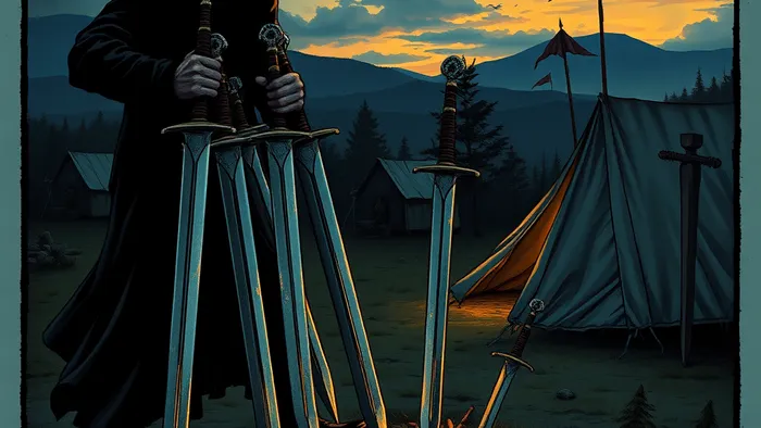 А что насчет двух оставленных мечей? Часто их трактуют как упущенную возможность, неверный расчет или ту часть правды, которую скрыть не удалось. Иногда — как предупреждение: не все ресурсы можно присвоить, не все последствия можно контролировать. Лагерь на заднем плане — это привычная среда, правила или сообщество, от которых человек отделяется своим поступком.