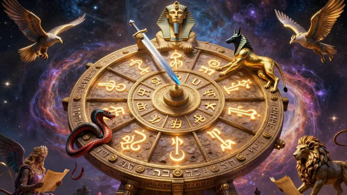 Посмотрите на фигуры, окружающие обод. Сверху восседает Сфинкс с мечом. Он — олицетворение равновесия и высшего разума, который остается неподвижным, пока мир вокруг сходит с ума. Сфинкс как бы говорит нам: «Центр — это единственное безопасное место». Под Колесом мы видим Анубиса, который стремится вверх, символизируя эволюцию сознания. С левой стороны спускается змей Тифон — воплощение энтропии и разрушения.