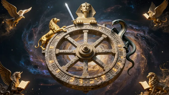 Если мы внимательно посмотрим на классическое изображение Колеса в колоде Райдера-Уэйта, мы увидим невероятную плотность смыслов. В углах карты расположены четыре «живых существа» из видения Иезекииля: человек, орел, лев и бык. Они читают книги. Это символы четырех фиксированных знаков Зодиака (Водолей, Скорпион, Лев, Телец), которые удерживают структуру мироздания. Но само Колесо... оно пестрит буквами и знаками. На ободе мы видим буквы T-A-R-O, которые можно прочитать и как ROTA (колесо), и как ORAT (говорит), и как TORA (закон). Это бесконечная игра слов, намекающая на то, что истина всегда в движении.