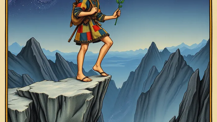 Он не падает. Он замер в шаге. Этот момент — суть карты. Это точка абсолютной свободы выбора. Шаг вперёд — падение (или полёт?) в неизвестность, шаг назад — возврат в привычный, но ограниченный мир. Шут балансирует на грани, и в этом балансе — вся его сила. Он учит нас, что самые важные решения часто принимаются в состоянии неопределённости, когда нет гарантий и чётких путей.