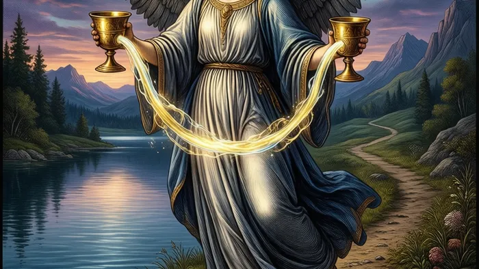 Давайте разберем детали, потому что в Таро мелочи — это и есть главное. Ангел стоит одной ногой в воде, другой — на суше. Это мост между бессознательным (вода) и сознательным (земля). Две чаши в его руках — это не просто сосуды. Левая (пассивная, лунная) и правая (активная, солнечная). Переливая воду, он не уравнивает уровни, а создает циркуляцию, обмен. А что насчет дороги, уходящей к горам? Это указание: гармония — не конечная точка, а путь. И он требует восхождения.