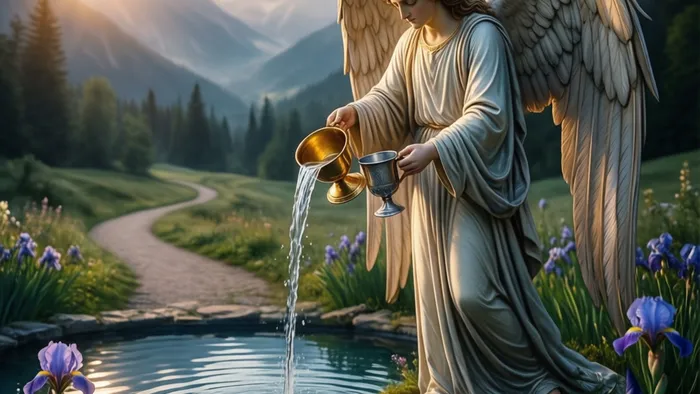 Каждая деталь здесь — ключ. Два сосуда в руках ангела: золотой (солнце, сознание, активное мужское) и серебряный (луна, подсознание, восприимчивое женское). Вода, переливающаяся между ними, — это сама жизнь, энергия, которая становится целебной только в движении. Дорога, ведущая от водоема к горам и солнцу, — путь индивидуации, который требует именно этого навыка смешения внутренних вод. А ирисы у ног ангела — цветы, названные в честь богини радуги Ириды, еще одного посредника между небом и землей.