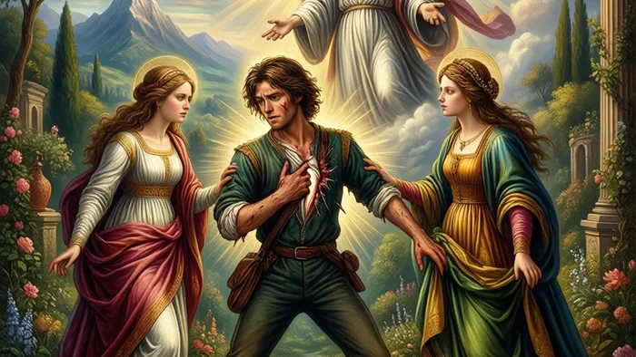 Архангел (часто Рафаил, связанный с исцелением) представляет высшее «Я», божественное руководство, интуицию или объективную точку зрения. Он символизирует возможность выйти за рамки дилеммы «или-или» и найти третий путь — решение, интегрирующее оба полюса конфликта и ведущее к целостности.