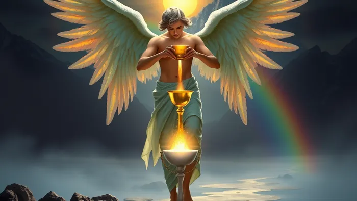Аркан XIV, Умеренность (Temperance), изображает ангела — часто андрогинного, стоящего одной ногой на земле, другой в воде. В руках у него два сосуда: из одного в другой он переливает жидкость, создавая непрерывный поток. За ним — тропа, ведущая к сияющему солнцу между двумя горами. Это и есть прямой, исчерпывающий ответ на запрос. Архетип Умеренности в Таро олицетворяет принцип сознательного смешения, алхимического синтеза и нахождения гармоничного потока между противоположностями (дух/материя, сознательное/бессознательное, активное/пассивное). Это не усреднение, а творческий акт, рождающий новое качество из, казалось бы, несовместимых элементов. Ангел не просто балансирует — он трансформирует.