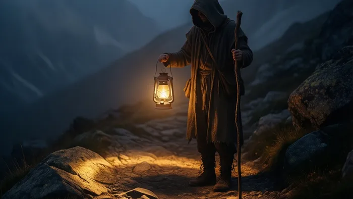 - Встреча: На какой-то извилине тропы вы замечаете в стороне фигуру. Это Отшельник. Он стоит, опершись на посох, его фонарь светит мягким, не слепящим светом. Рассмотрите детали, которые приходят сами: его одежду, выражение лица (если оно видно), окружающие камни.